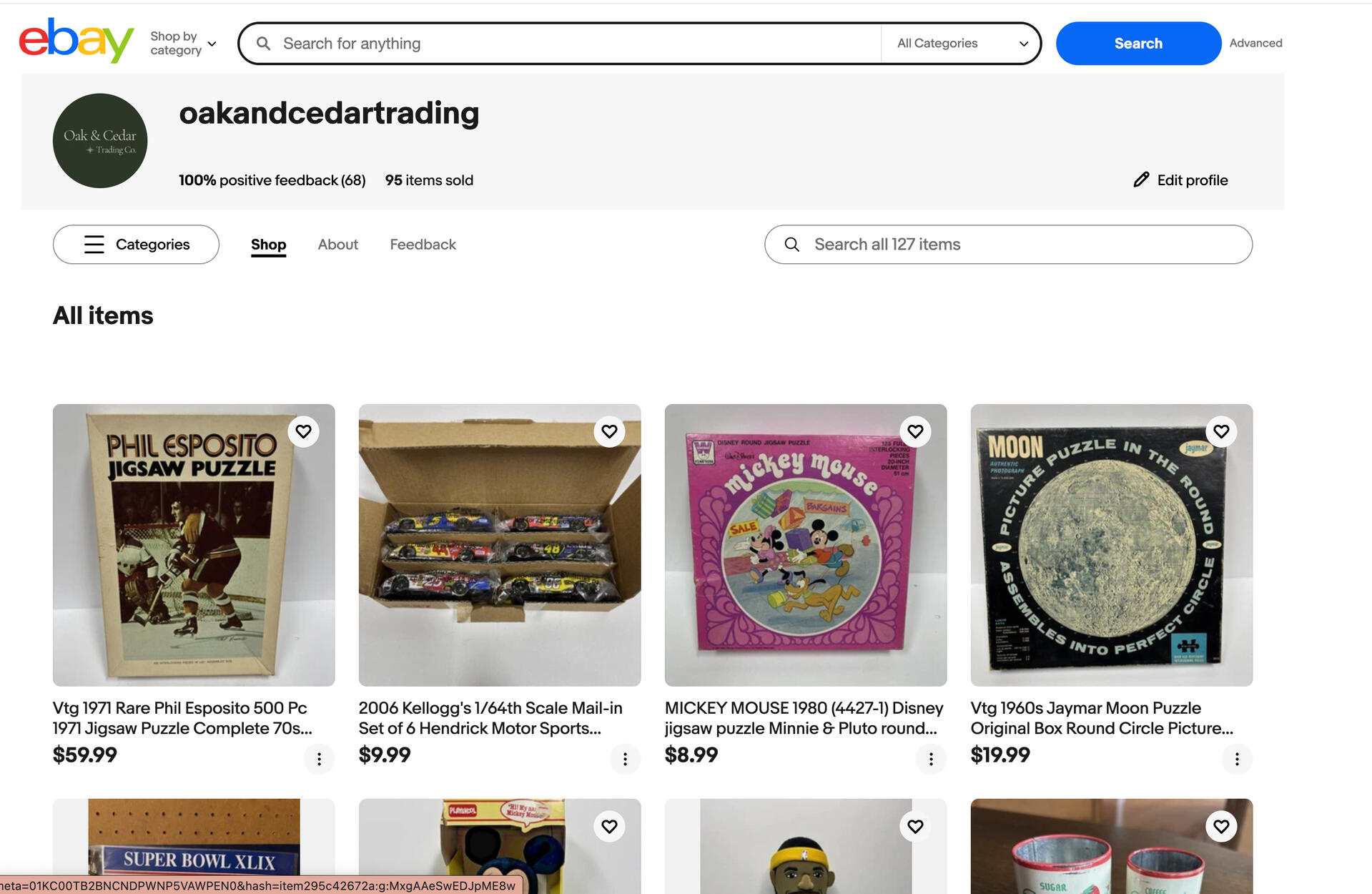 From puzzles and toys to décor and rare curiosities, Oak & Cedar Trading Co. brings you carefully sourced vintage items from estate sales, auctions, and local collections.We pack safely, ship quickly, and stand behind everything we sell.